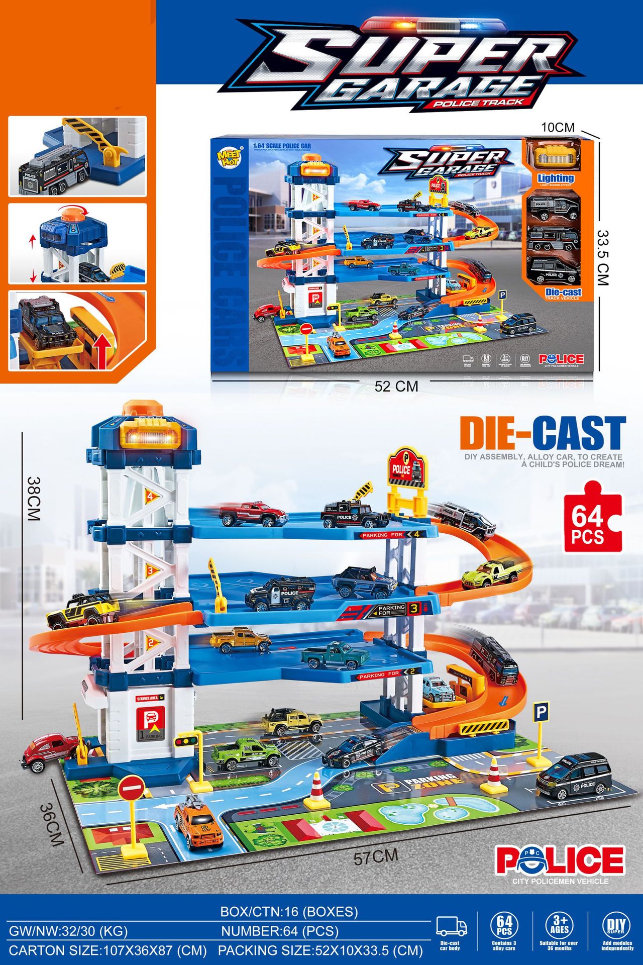 Color: Light and music 4-layer city police lift parking lot with gold car with road signs and maps, light and music 4-layer city fire lift parking lot with gold car with road signs and maps, light and music 4-layer city engineering lift parking lot with gold car with road signs and maps, light and music lift 4-layer racing car parking lot with 3 alloy cars with maps and road signs (including 3*AG13 batteries)